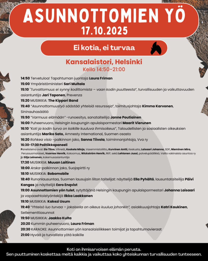 - Ei kotia, ei turvaa – Asunnottomien yön päätapahtuma Helsingin Kansalaistorilla lokakuun 17. päivä